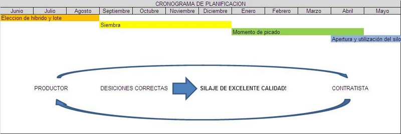 Desde nuestro equipo de trabajo hacemos mucho hincapié en la planificación, ya que para llegar a un silaje de calidad primero debemos atravesar por varias etapas en las cuales intervienen varios factores climáticos, agronómicos y desiciones de manejo. La buena planificación involucra tanto al productor como al contratista, pasando primero por la elección del Híbrido y lote a sembrar, densidad y sistema de siembra, fertilización, momento y tamaño de picado, inoculado y compactación del material. Si tomamos correctas decisiones en todos estos aspectos vamos a lograr que el hibrido elegido desarrolle su potencial en el ambiente seleccionado y obtener un silaje de excelente calidad. Para todo esto se debe trabajar en conjunto productor y contratista.